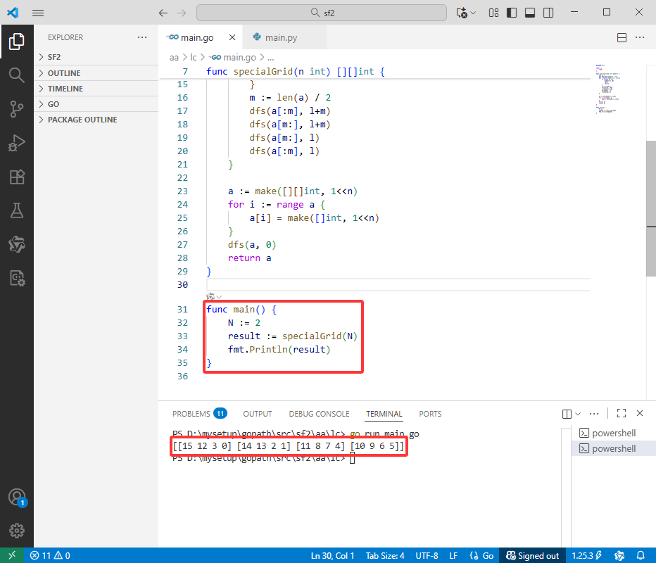2025-10-22:填充特殊网格。用go语言,给定非负整数 N,要求构造一个边长为 的方阵,用 0 到 这 个整数恰好一次地填满整个矩阵。把矩阵沿中线分成四个等大的子方阵(左上、右上、左下、右下),需要满足: