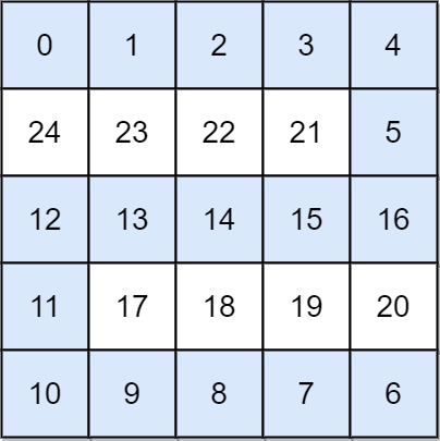 输入: grid = [[0,1,2,3,4],[24,23,22,21,5],[12,13,14,15,16],[11,17,18,19,20],[10,9,8,7,6]]