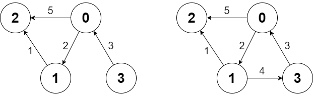 g.shortestPath(3, 2); // 返回 6 。从 3 到 2 的最短路径如第一幅图所示:3 -> 0 -> 1 -> 2 ,总代价为 3 + 2 + 1 = 6 。