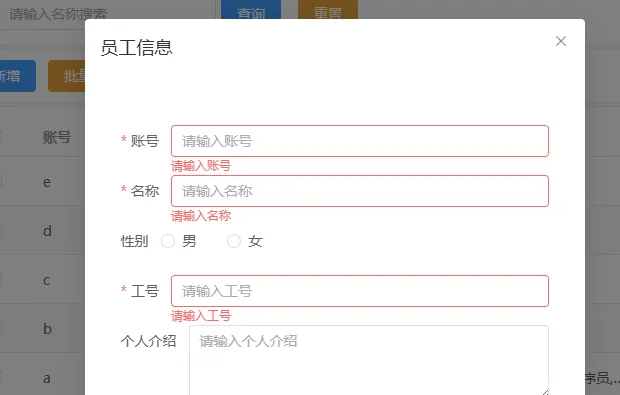 给Employee实体类加属性以及set,get方法 在mapper文件的新增和更新操作上进行修改 前端页面的表单上加上账号列 在新增的时候,我们需要做一个表单的校验,如果账号没填就点保存是保存不了的。