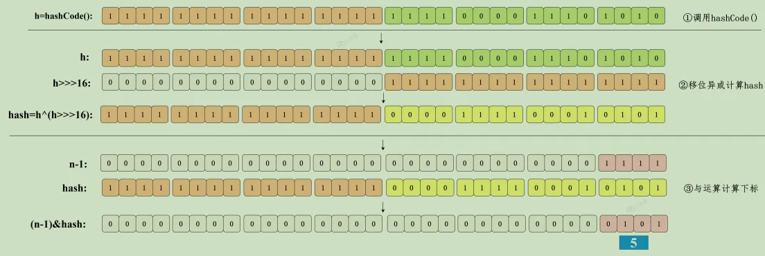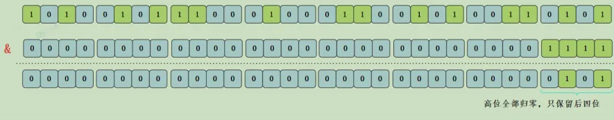 因为这样(数组长度 - 1)正好相当于一个 “低位掩码”。 与 操作的结果就是散列值的高位全部归零,只保留低位值,用来做数组下标访问。以初始长度 16 为例,16-1=15。2进制表示是 0000 0000 0000 0000 0000 0000 0000 1111 。和某个散列值做与 操作如下,结果就是截取了最低的四位值。