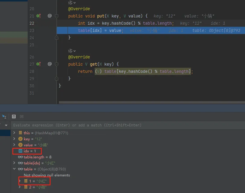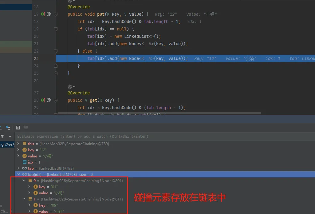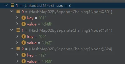 通过测试结果可以看到,碰撞前 map.get("01") 的值是小红,两次下标索引碰撞后存放的值则是小娟 这也就是使用哈希散列必须解决的一个问题,无论是在已知元素数量的情况下,通过扩容数组长度解决,还是把碰撞的元素通过链表存放,都是可以的