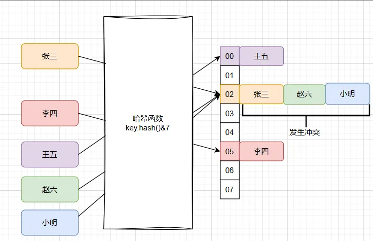 当赵六和小明都映射到下标索引为02的位置时就发生了冲突,情况就糟糕了,因为不能满足O(1)的时间复杂度获取元素的诉求了。