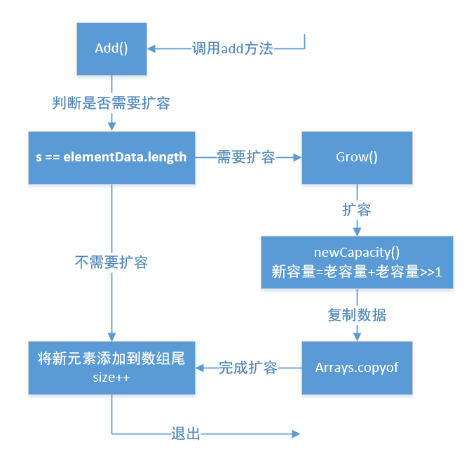 add(E e) 方法调用: 用户调用 add 方法尝试添加一个新元素。ensureCapacityInternal): add 方法首先会调用 ensureCapacityInternal 来确保内部数组有足够的容量。calculateCapacity): 如果是第一次添加元素(即内部数组是 EMPTY_ELEMENTDATA),则计算出初始容量(通常是 DEFAULT_CAPACITY 即 10 或用户指定的 minCapacity 中的较大值)。ensureExplicitCapacity): 这一步会判断当前数组的实际长度是否小于所需的最小容量。grow): 如果 minCapacity 大于 elementData.length,则会调用 grow 方法执行实际的扩容操作。grow 方法会根据当前容量计算一个新的容量值(通常是旧容量的 1.5 倍)。minCapacity,或者新容量超过了 MAX_ARRAY_SIZE,则会进行相应的调整。Arrays.copyOf 将旧数组的元素复制到一个新的、更大容量的数组中。elementData 数组中,size 增加。