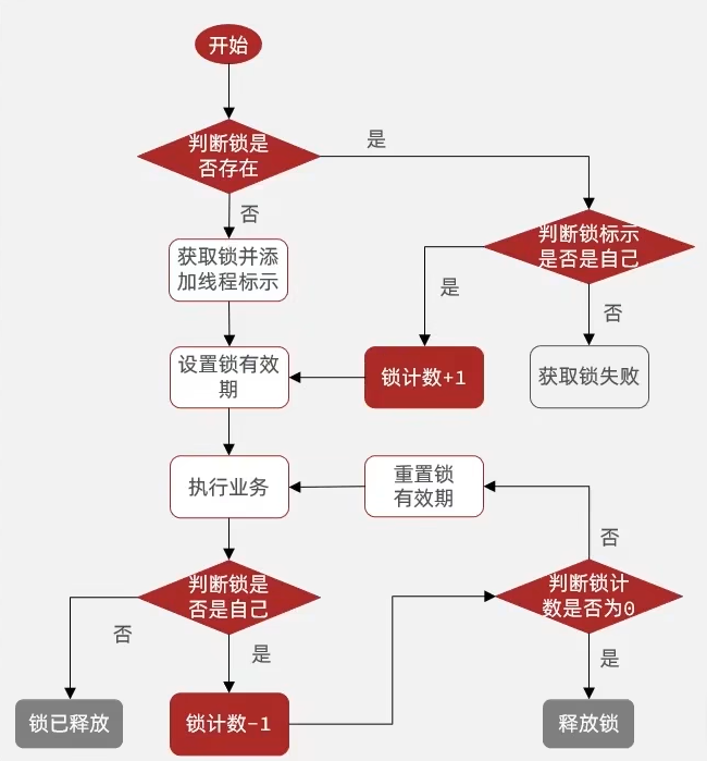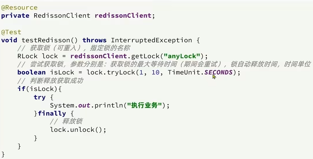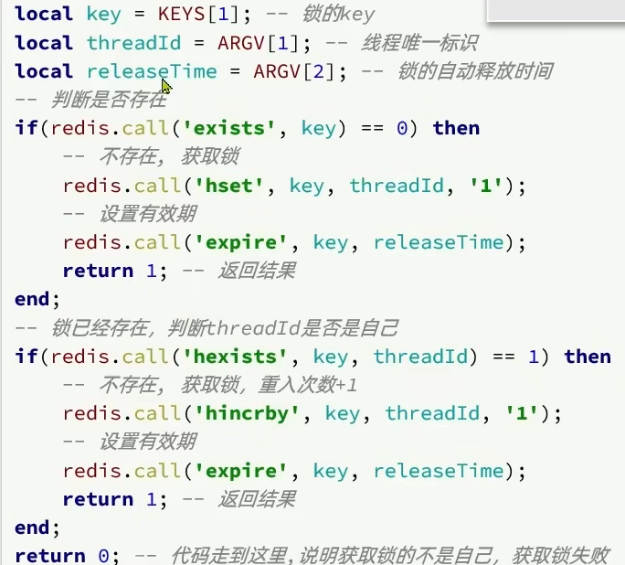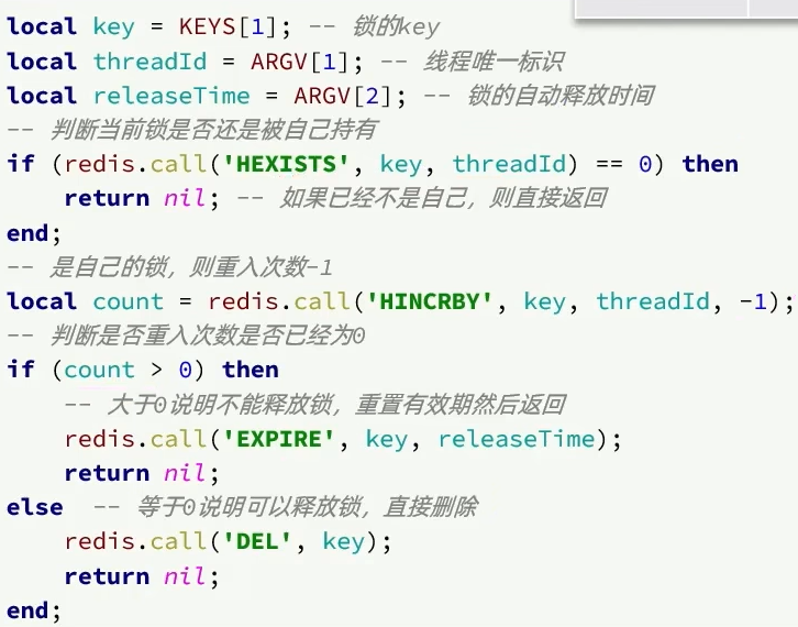 解决问题一:不可重入 set命令的分布式锁不可以实现锁重入,因为同一个线程setnx都是一样的 故可以参考ReentrantLock实现锁重入的原理,每次相同的线程又一次来获取锁就对state变量值进行++操作 分布式锁Redisson和自定义分布式锁的一些区别:底层是hash结构,因为value部分不仅仅要存储"获取到锁的线程标识",还要存储"当前线程重入的次数"(支持锁重入的原理). 解决问题二:不可重试 set命令的分布式锁获取锁失败之后会立即返回false,不会重试。 源码上tryLock()API中传入了最大等待时间,则说明开启了失败重试机制 通过源码分析,当第一次获取锁失败后且还处于等待时间时,不会立马再去尝试获取锁,而是先去订阅,订阅别人释放锁的信号,保证当有人执行完释放锁的lua脚本后它能监听到。但是一旦等待的时间超过了最大等待时间waitTime,就会取消订阅,不会重试了。 订阅之后会在while(true)的一个死循环中不断的等待 尝试 等待 尝试… 在释放锁的源码lua中,释放锁最后会发布一个释放锁的信号,这些订阅了的线程就会监听到!!! 解决问题三:超时释放(看门狗机制) 只有获取锁成功了才会有leasetime的事情