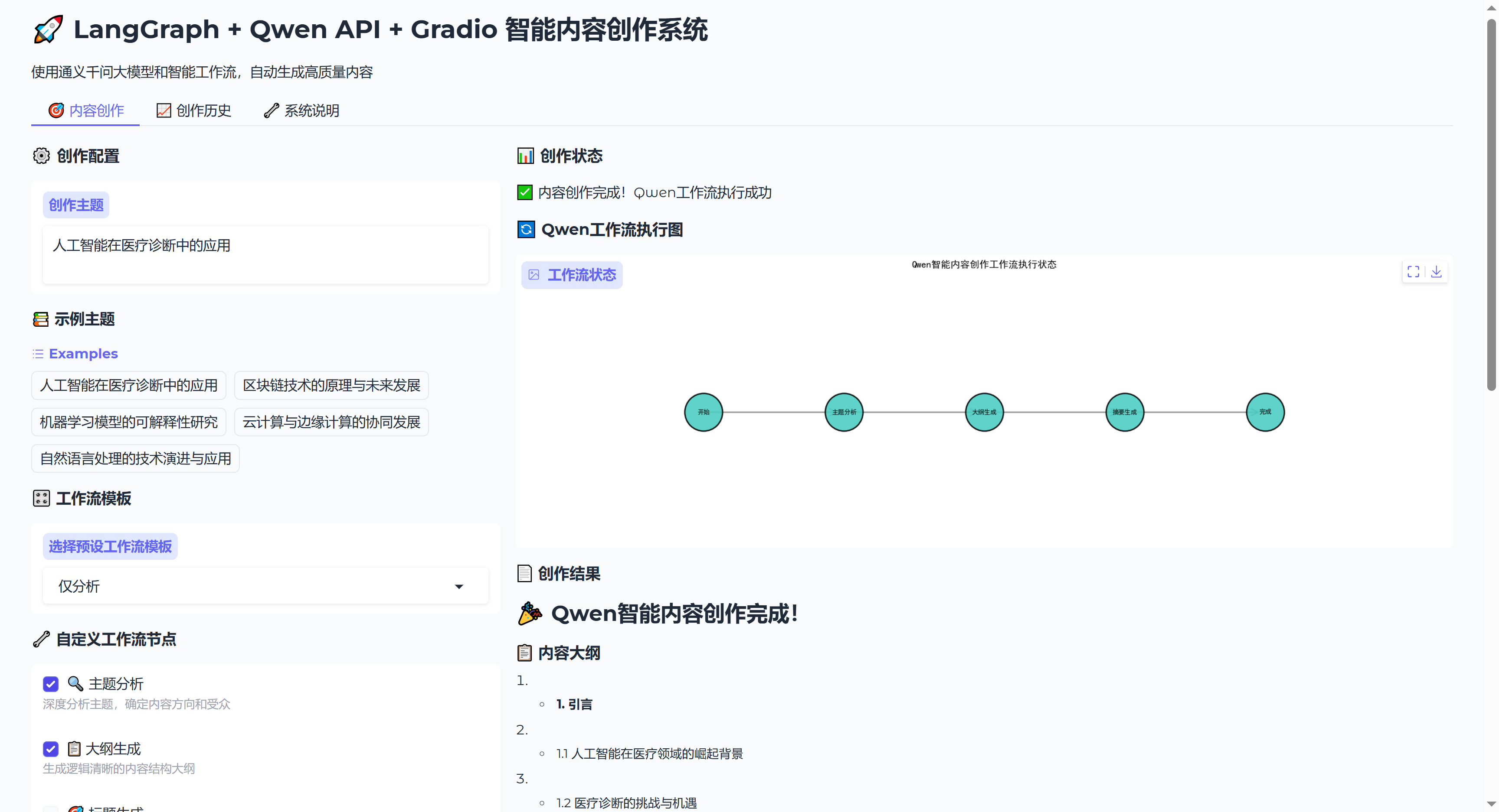 print("🚀 启动 LangGraph + Qwen API + Gradio 智能内容创作系统...")