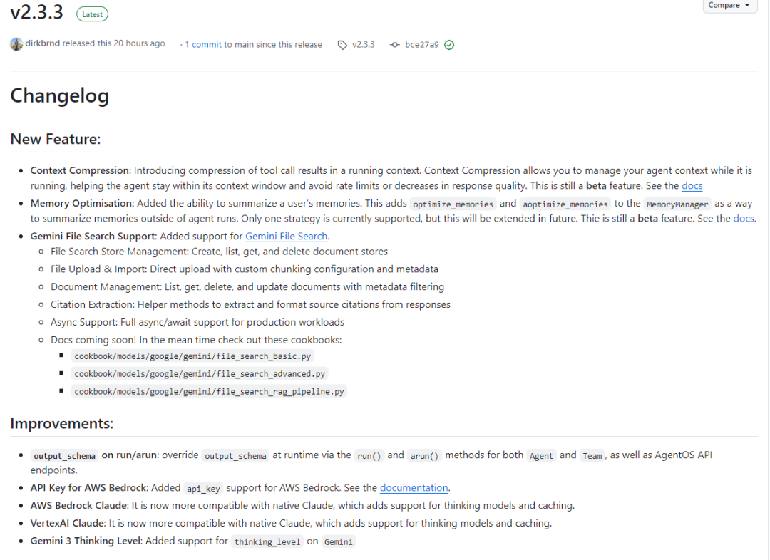 agno v2.3.3 版本是一次 功能与性能的双重提升 更新,尤其在 上下文压缩、内存优化、文件搜索能力 方面有重大改进,同时增强了 AWS Claude、VertexAI Claude 的兼容性,并全面支持 异步任务。
