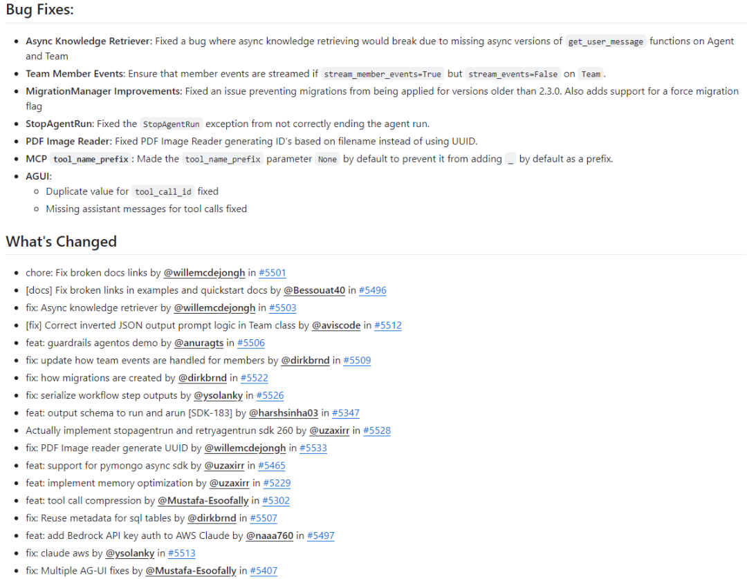 2025 年 11 月 27 日,agno 发布了 v2.3.3 版本,本次更新带来了多项新功能、性能改进以及 Bug 修复,尤其是在上下文管理、内存优化、文件搜索和异步支持方面有了显著增强。以下为详细更新内容。