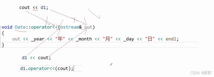 因为Date* this占据了⼀个参数位置,使⽤d<<cout不符合习惯。