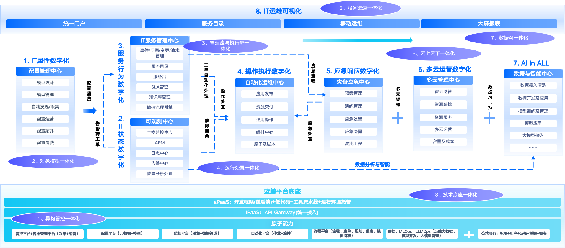 嘉为蓝鲸AIOps一体化、平台化、智能化运维解决方案,以 “全栈可观测+全流程自动化+全场景智能化” 为核心,八大模块环环相扣、协同发力,构建起覆盖 IT 运维全生命周期的闭环能力。