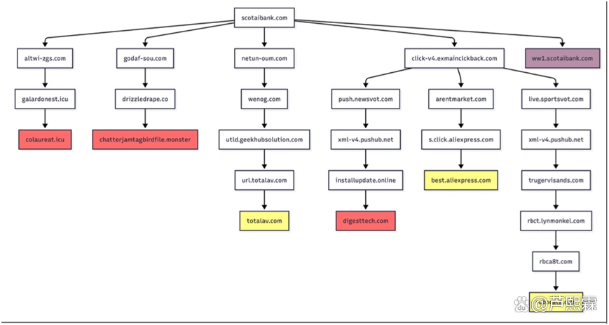 访问scotaibank.com时的重定向路径示例。每个分支都包含一系列观察到的域名,包括颜色编码的登陆页面。图片:Infoblox。
