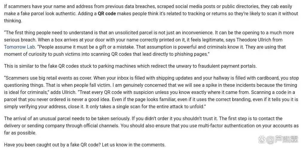随着无接触配送与移动支付的普及,二维码(QR Code)已成为连接物理世界与数字服务的关键媒介。消费者习惯通过扫描包裹上的二维码查询物流状态、申请退货或验证商品真伪。然而,这一便利性正被网络犯罪分子系统性滥用。2025年11月,安全媒体BetaNews披露,诈骗团伙正大规模实施一种新型钓鱼攻击——通过投递印有受害者真实姓名地址的虚假包裹,并附带恶意二维码,诱使其在不知情中访问钓鱼网站。该手法被业界称为“Quishing”(QR + Phishing),其独特之处在于将社会工程攻击从纯数字空间延伸至物理交付链,形成“线下诱导—线上窃密”的闭环。