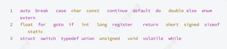 C语⾔中有⼀批保留的名字的符号,⽐如: int 、 if 、 return ,这些符号被称为保留字或者关键