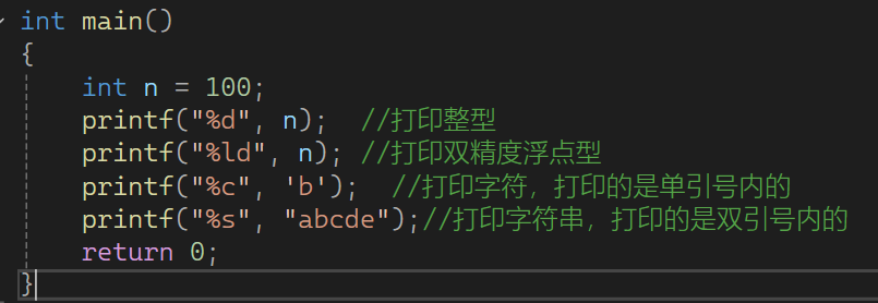 其中,%d,%ld 等等这些称为占位符,会被后边的n,b,abcdet替换,然后打印出来。
