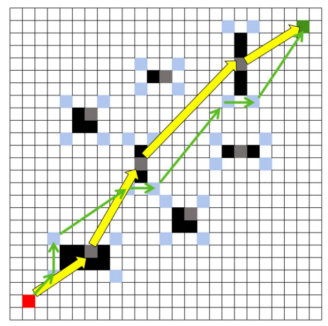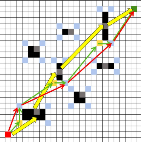 冗余点剔除:找到存在环绕路径的障碍物区块,从上一区块到当前区块所有路过的栅格进行遍历,如果跟后面某个栅格距离更短或者连线未穿越障碍物,则移除路径上当前障碍物区块在当前栅格前面的所有栅格。剔除冗余点后,使转折次数更少,且总路径更短;粗黄箭头线条表示外层算法规划的路径,绿色箭头线条为外层算法和内层算法联合规划出的初始路径,红色箭头线条即为剔除冗余点之后形成的新路径,黄色栅格即为路径节点中被剔除掉的冗余点,冗余点剔除之后,可以使总路径长度更短、转折次数更少,路径更平滑。