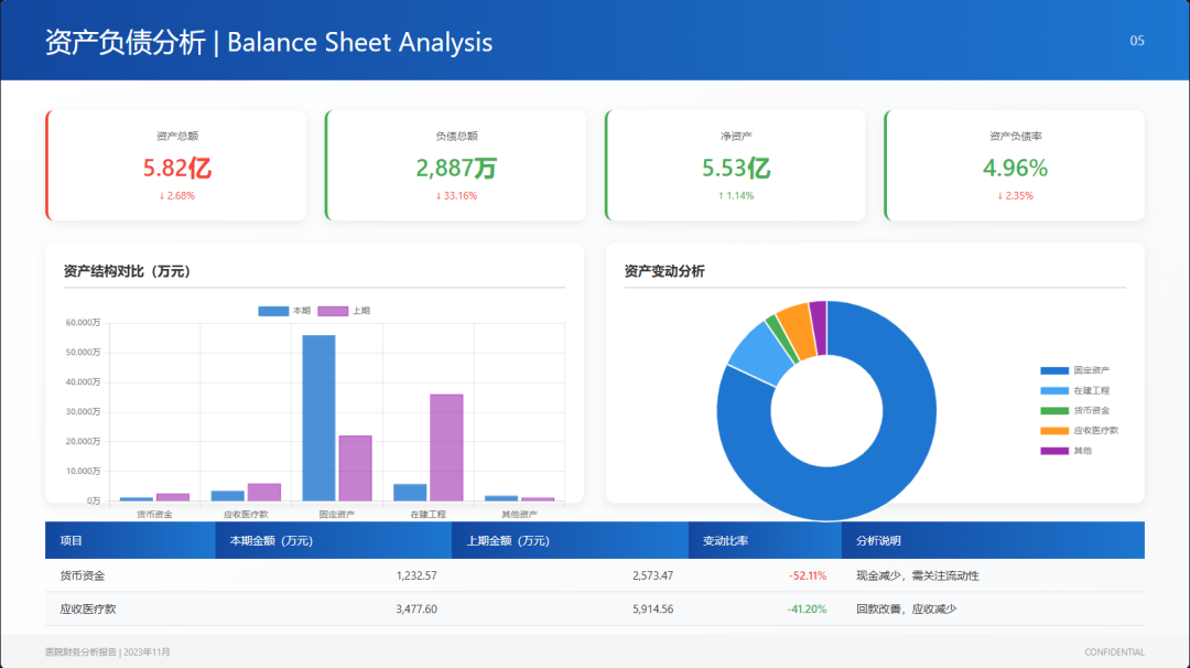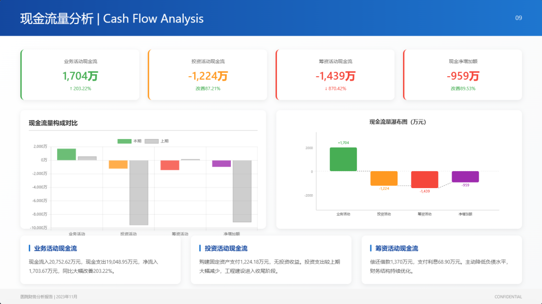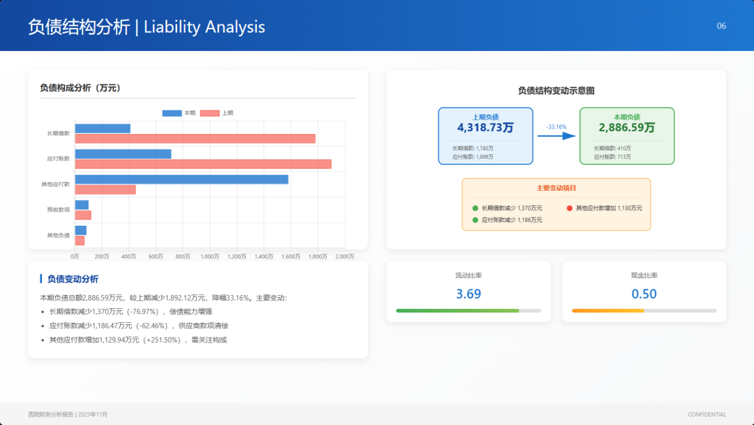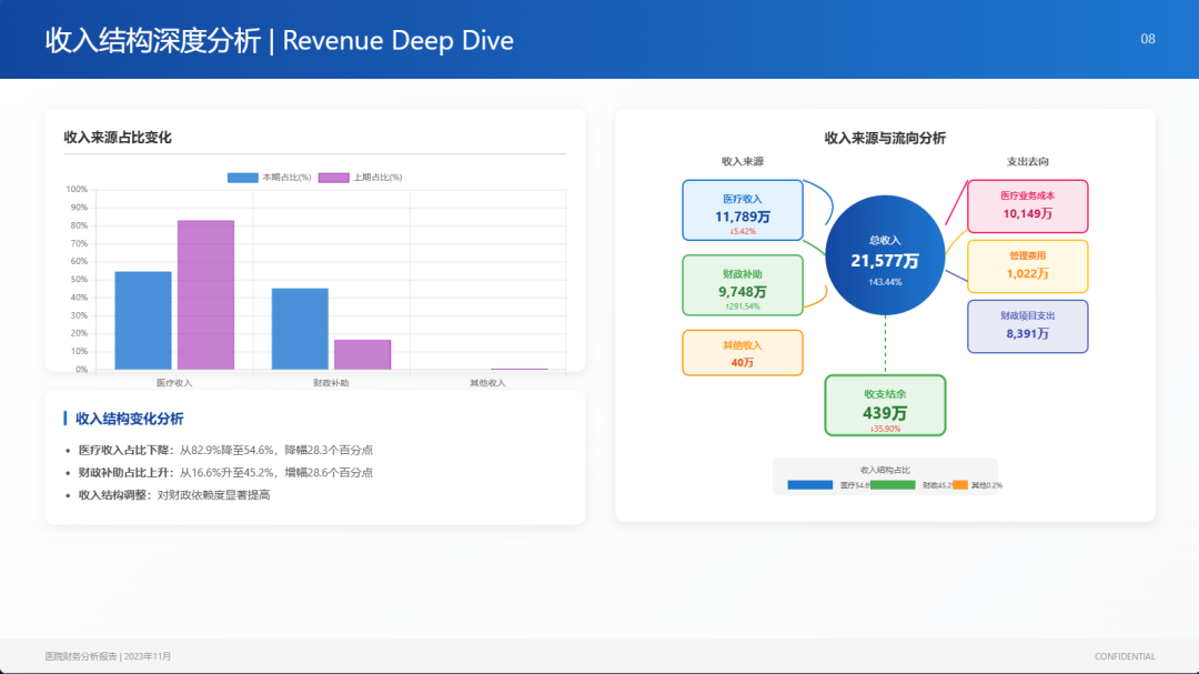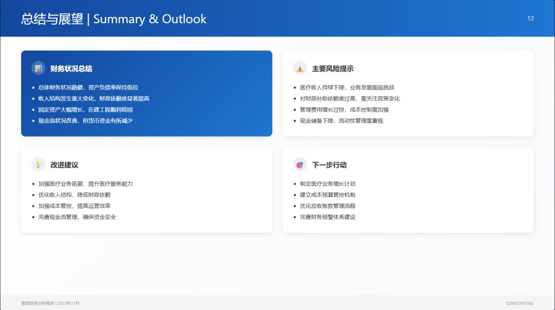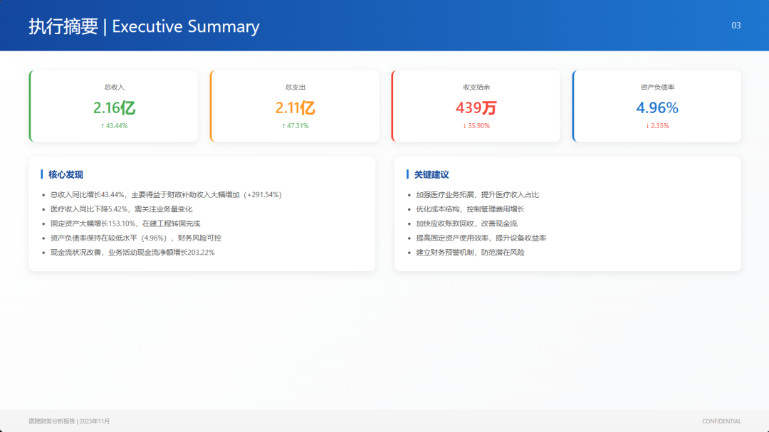 当前项目目录下有一个财务报告.pdf 文件,是关于一个医院的财务报告分析文档。我现在需要你深刻的理解这个文件的内容,然后帮我输出一份图文并茂的财务报告html网页。注意我需要html网页类似采用PPT方式进行程序,每页PPT内容都是16:9,长度1600,宽度900。我需要能够配合主流的在线图表进行可视化展示,同时配合相关的SVG绘图进行逻辑图的绘制。具体逻辑图的绘制可以参考当前项目下的SBR.md建模方法提示语进行。注意整个报告采用国际大咨询公司的咨询风格,商务风格,图文并茂,方便邮件发送他人阅读。最终输出一个完整的html网页文件给我。整个ppt页数在10到20页之间。
