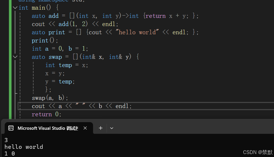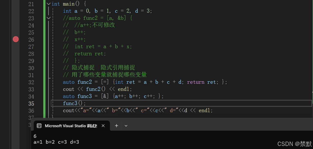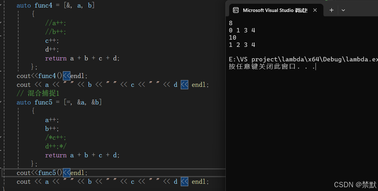 3. 第二种捕捉方式是在捕捉列表中隐式捕捉,我们在捕捉列表写一个=表示隐式值捕捉,在捕捉列表写一个&表示隐式引用捕捉,这样我们 lambda 表达式中用了那些变量,编译器就会自动捕捉那些变量。