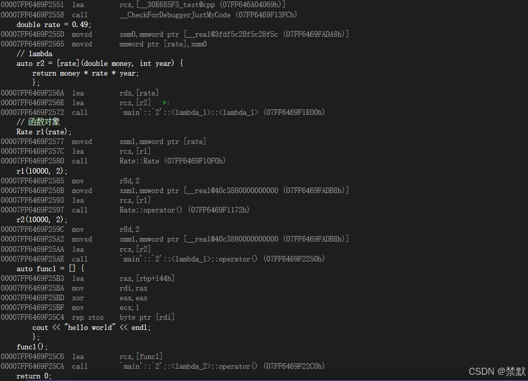 // 汇编层可以看到r2 lambda对象调用本质还是调用operator(),类型是lambda_1,这个类型名