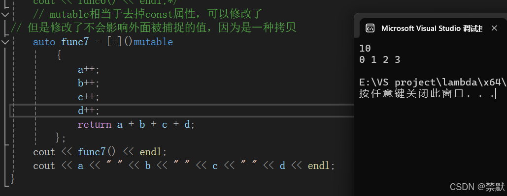 cout << func6() << endl;默认情况下, lambda 捕捉列表是被const修饰的,也就是说传值捕捉的过来的对象不能修改,