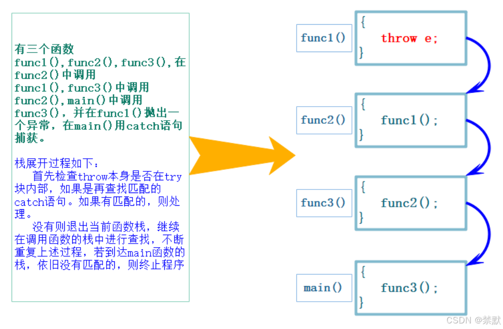 catch 语句: catch 语句处理异常。catch: catch,程序继续执行 catch 语句中的代码。catch,最终会到达 main 函数。main 函数也没有捕获异常,程序会调用 std::terminate() 终止执行。