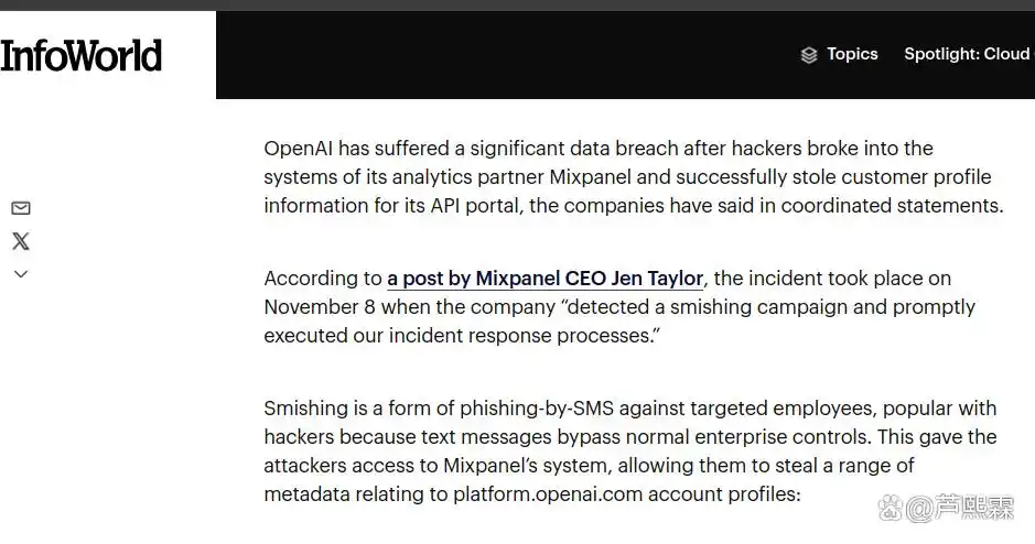 值得注意的是,此次泄露并未涉及OpenAI自身核心系统,亦未暴露用户聊天记录、API密钥或支付信息。然而,被盗数据包括客户提供的姓名、注册邮箱、浏览器类型、地理位置(城市/国家)及组织ID等元信息,这些信息虽看似低敏感,却足以支撑后续精准钓鱼、身份冒充或社会工程攻击。更重要的是,事件揭示了一个结构性问题:即便主体平台具备强大的安全能力,其生态系统中的薄弱环节仍可能成为攻击者的有效突破口。