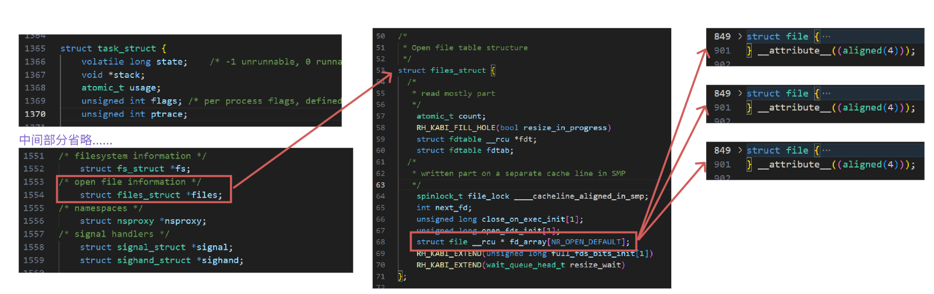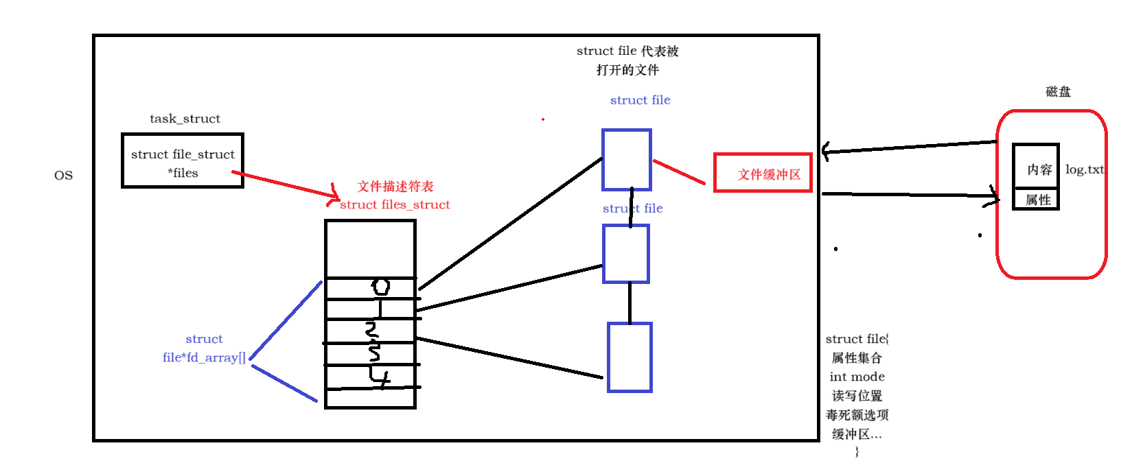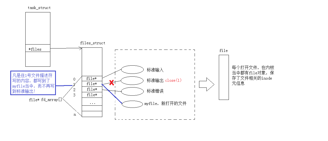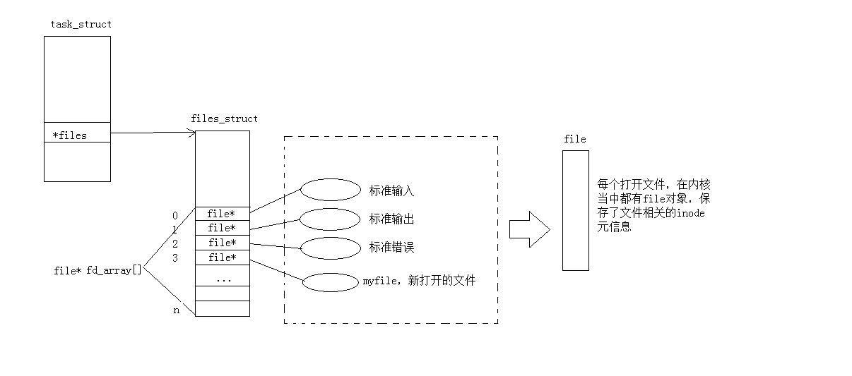 而现在知道,文件描述符就是从0开始的小整数。当我们打开文件时,操作系统在内存中要创建相应的数据结构来描述目标文件。于是就有了file结构体。表示一个已经打开的文件对象。而进程执行open系统调用,所以必须让进程和文件关联起来。每个进程都有一个指针*files, 指向一张表files_struct,该表最重要的部分就是包含一个指针数组,每个元素都是一个指向打开文件的指针!
