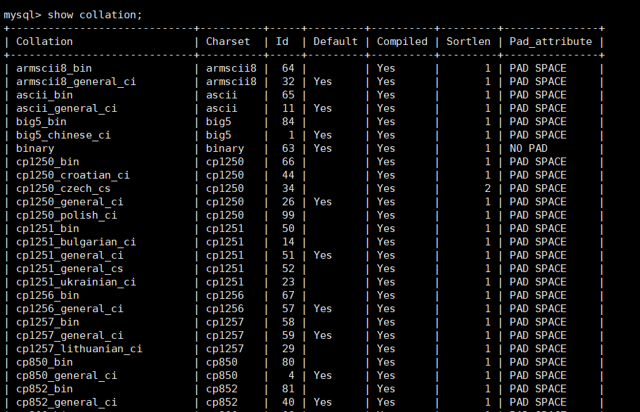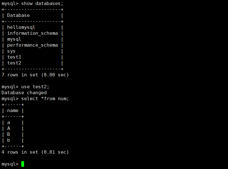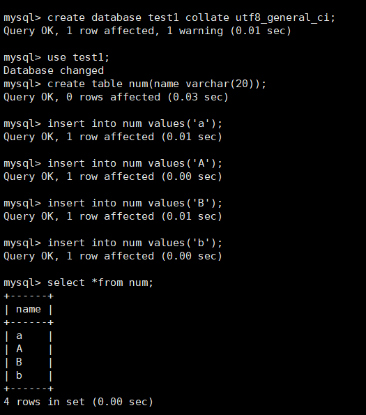 create database test1 collate utf8_general_ci; use test1; create table name(name varchar(20)); insert into num values('a'); insert into num values('A'); insert into num values('b'); insert into num values('B'); select *from num;