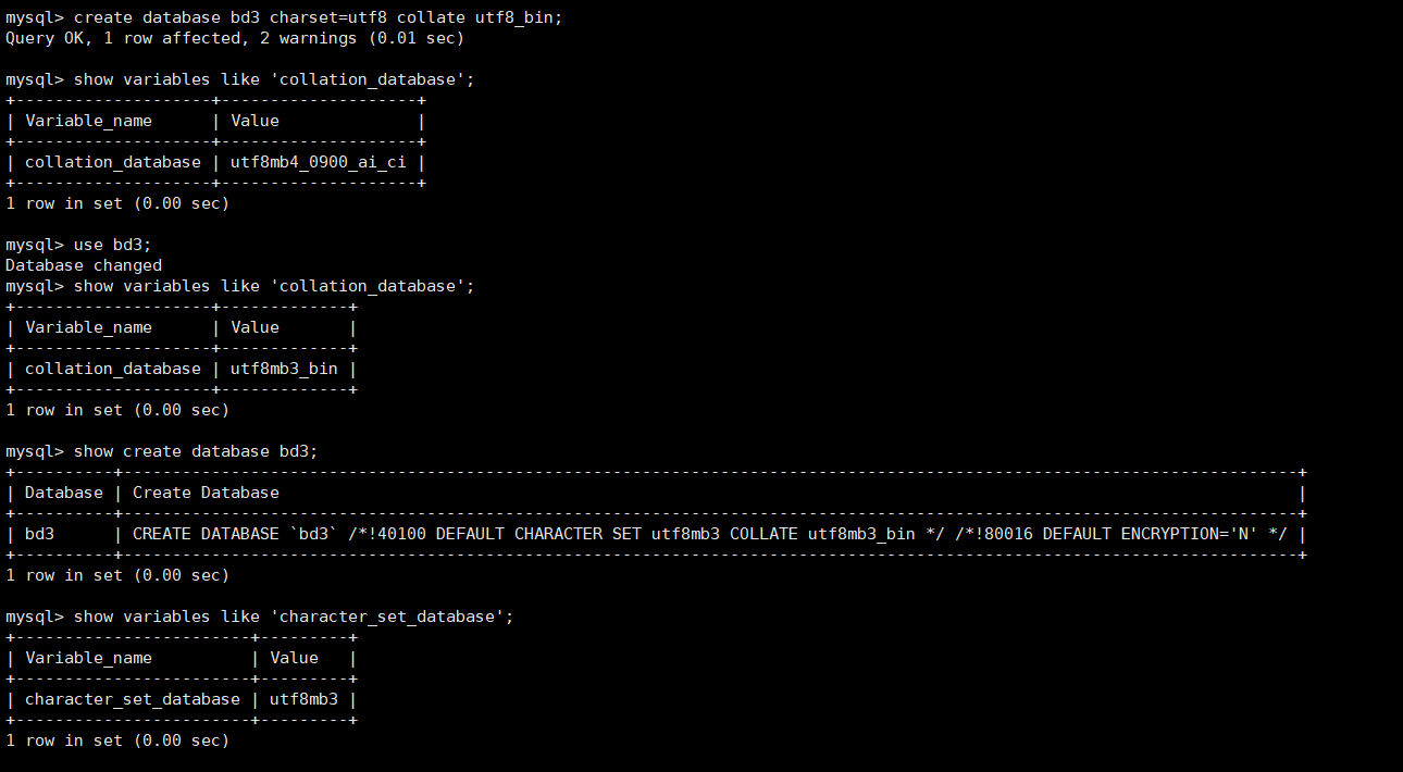 create database bd2 charset=utf8;创建一个使用 utf 字符集,并带校对规则的 bd 3 数据库。