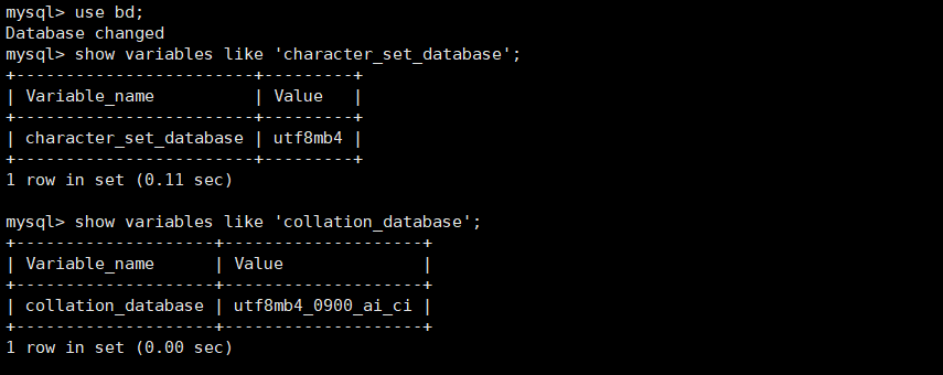 create database bd;说明:当我们创建数据库没有指定字符集和校验规则时,系统使用默认字符集:utf8,校验规则