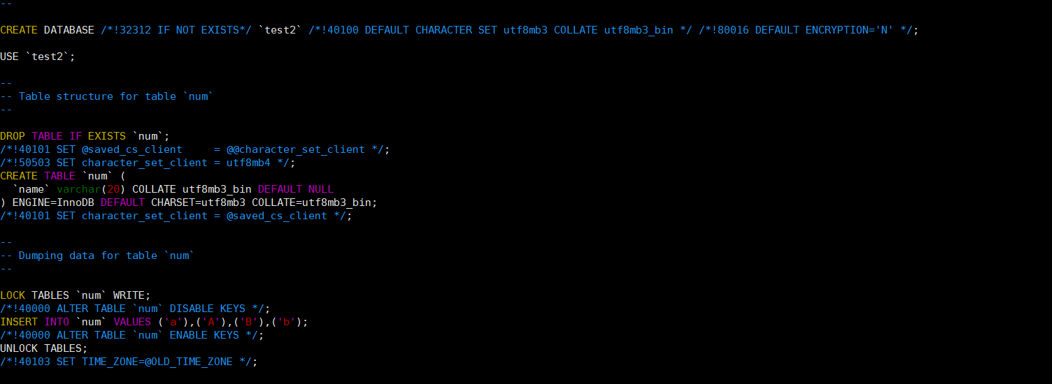 这时,可以打开看看 test2_backup.sql 文件里的内容,其实把我们整个创建数据库,建表,导入数据的语句都装载这个文件中。