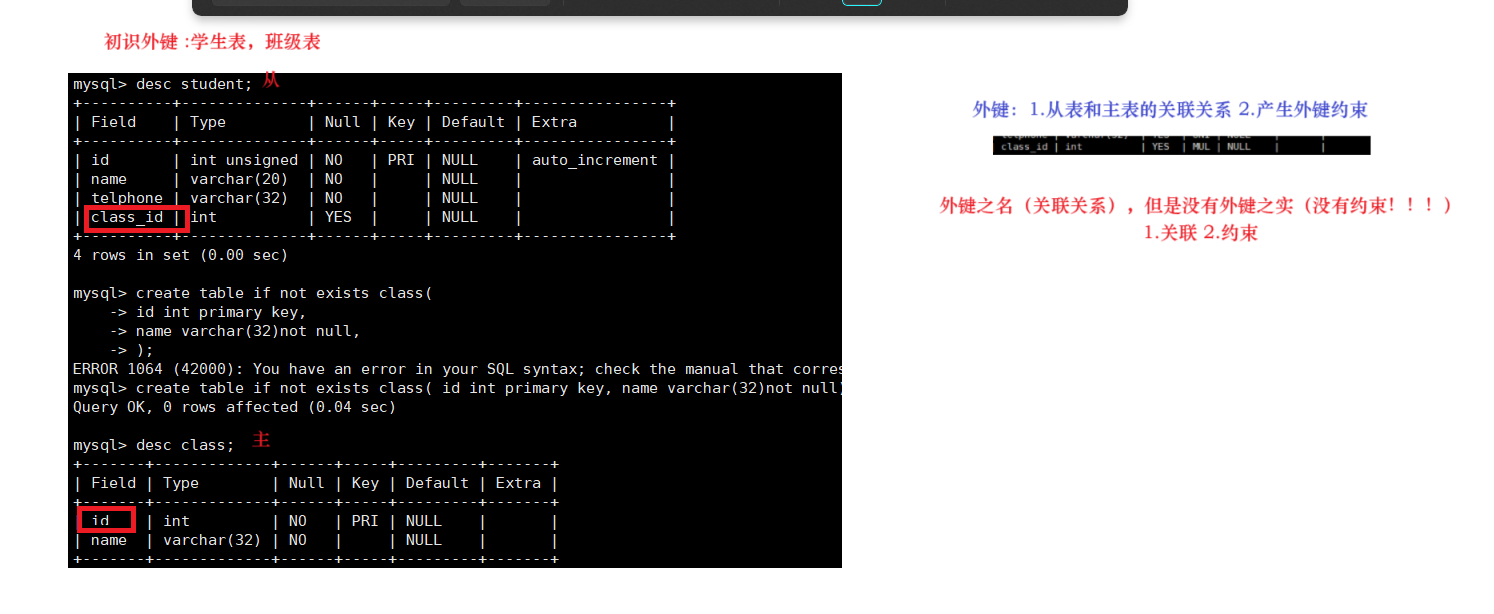 mysql> create table if not exists class( id int primary key, name varchar(32)not null);再创建从表