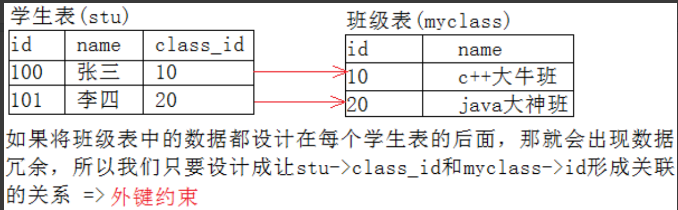 首先我们承认,这个世界是数据很多都是相关性的。 理论上,上面的例子,我们不创建外键约束,就正常建立学生表,以及班级表,该有的字段我们都有。 此时,在实际使用的时候,可能会出现什么问题? 有没有可能插入的学生信息中有具体的班级,但是该班级却没有在班级表中? 比如只开了 100 班, 101 班,但是在上课的学生里面竟然有 102 班的学生 ( 这个班目前并不存在) ,这很明显是有问题的。 因为此时两张表在业务上是有相关性的,但是在业务上没有建立约束关系,那么就可能出现问题。 解决方案就是通过外键完成的。建立外键的本质其实就是把相关性交给mysql 去审核了,提前告诉 mysql 表之间的约束关系,那么当用户插入不符合业务逻辑的数据的时候,mysql 不允许你插入。