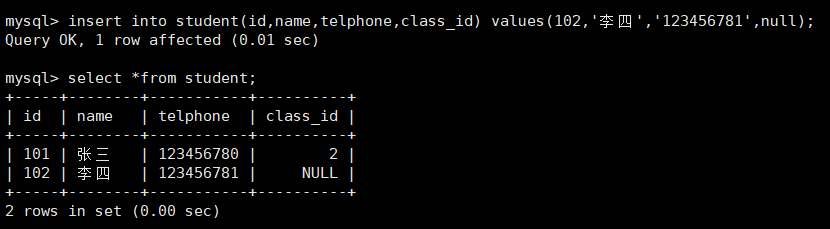 mysql> insert into student(id,name,telphone,class_id) values(101,'张三','123456780',2);