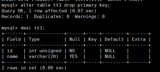 ERROR 1062 (23000): Duplicate entry '1' for key 'tt3.PRIMARY'当表创建好以后但是没有主键的时候,可以再次追加主键