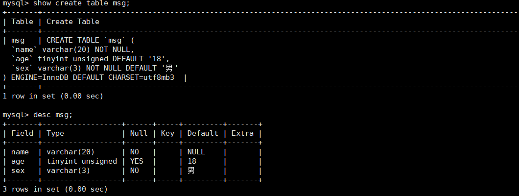 mysql> create table if not exists msg( name varchar(20) not NULL,
