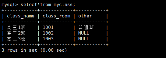 1 row in set (0.00 sec)mysql> insert into myclass(class_name,class_room,other) values("高三1班","1001","普通班");insert into myclass(class_name,class_room,other) values("高三2班","1002",NULL);