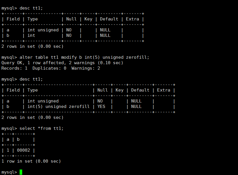 1 row in set (0.00 sec)可以看出数据库内部存储的还是2,00002只是设置了zerofill属性后的一种格式化输出而已。