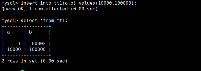 mysql> insert into tt1 values(1,2);