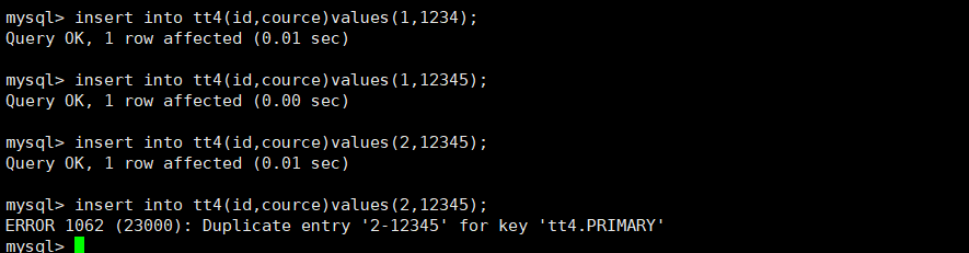 mysql> create table tt4( id int unsigned, cource char(10) comment "课堂代码", score tinyint unsigned default 60 comment '成绩', primary key(id ,cource ));