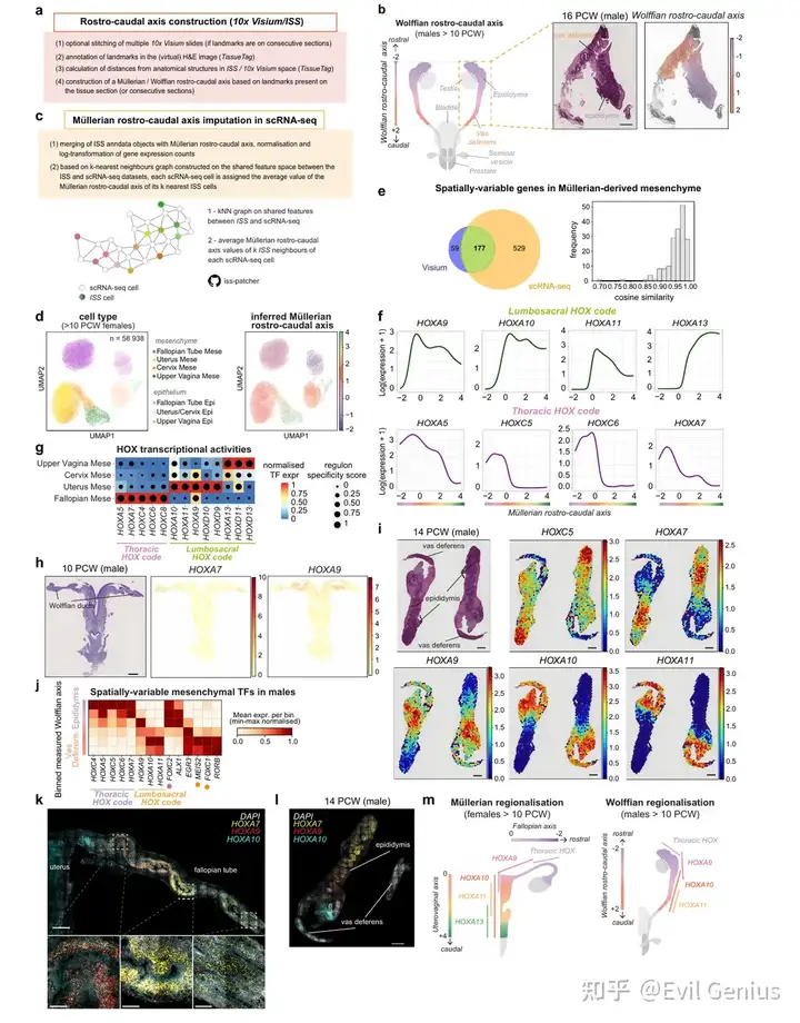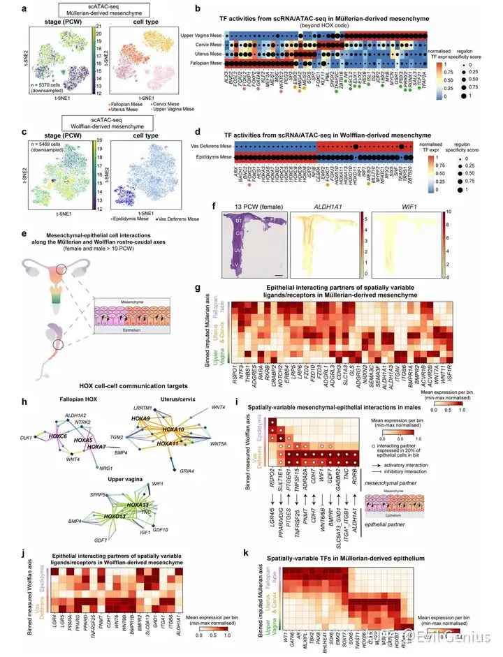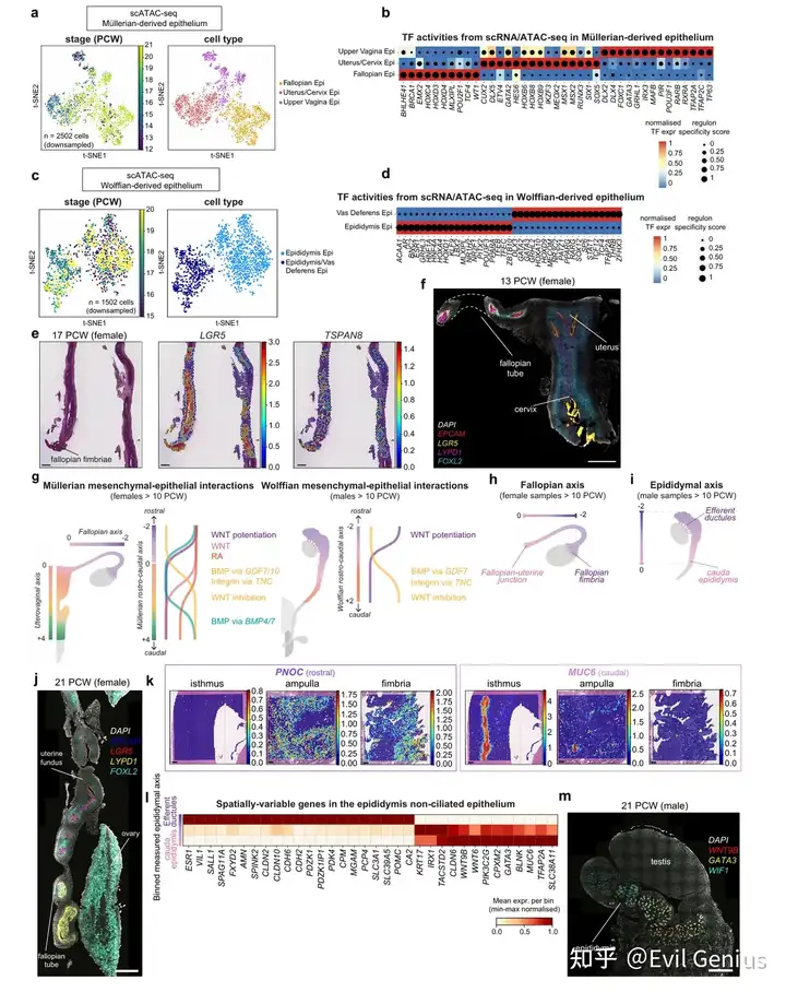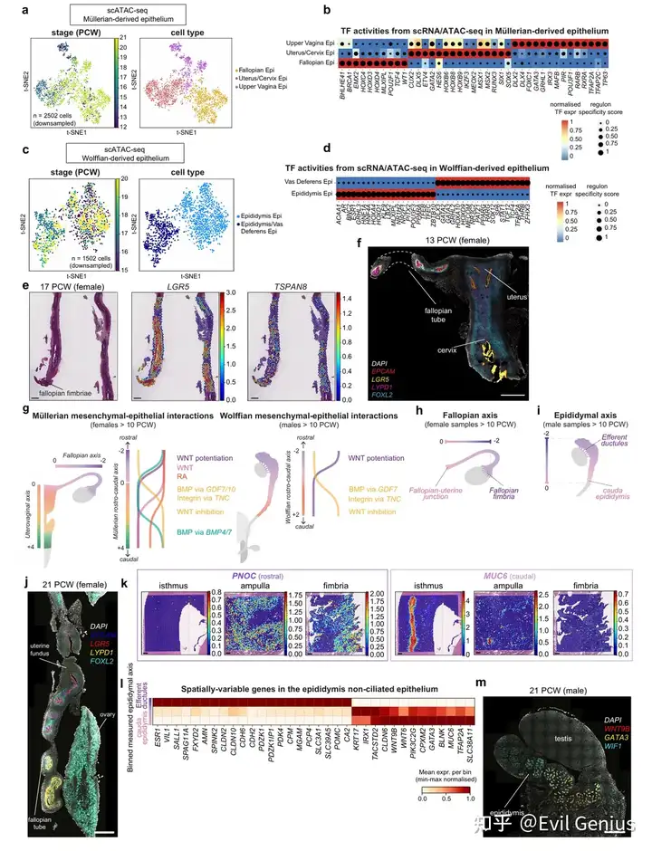 通过整合单细胞测序、空间转录组及表观基因组数据,系统揭示了人类苗勒管与中肾管在胚胎发育过程中的区域分化机制。