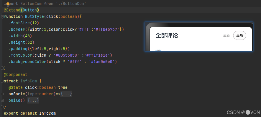 最新和最热是两个按钮组件,Extend装饰器进行修改,当未被选中时是一种状态,被选中时是另外一种状态。这两种状态的样式我是根据最左侧的颜色来进行适当调整的,大家也可以效仿。