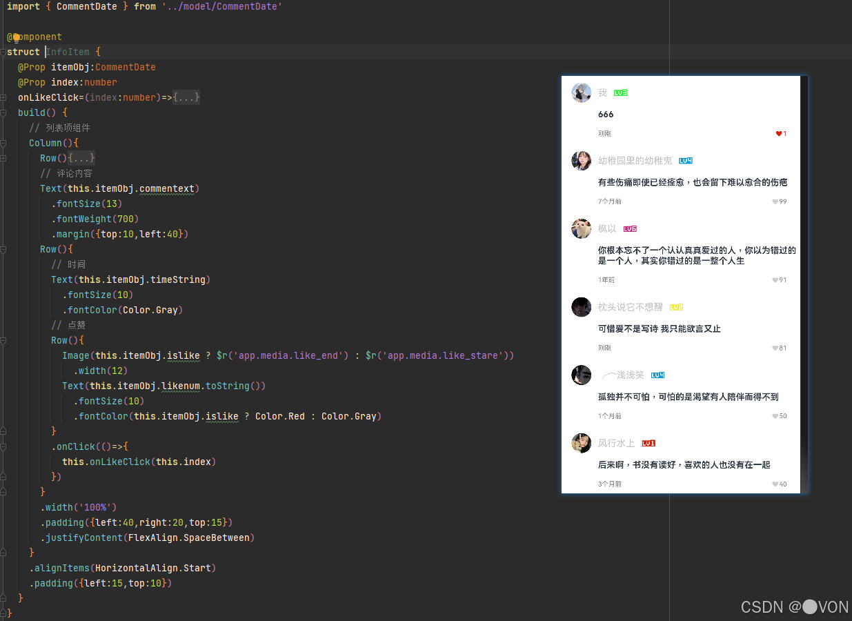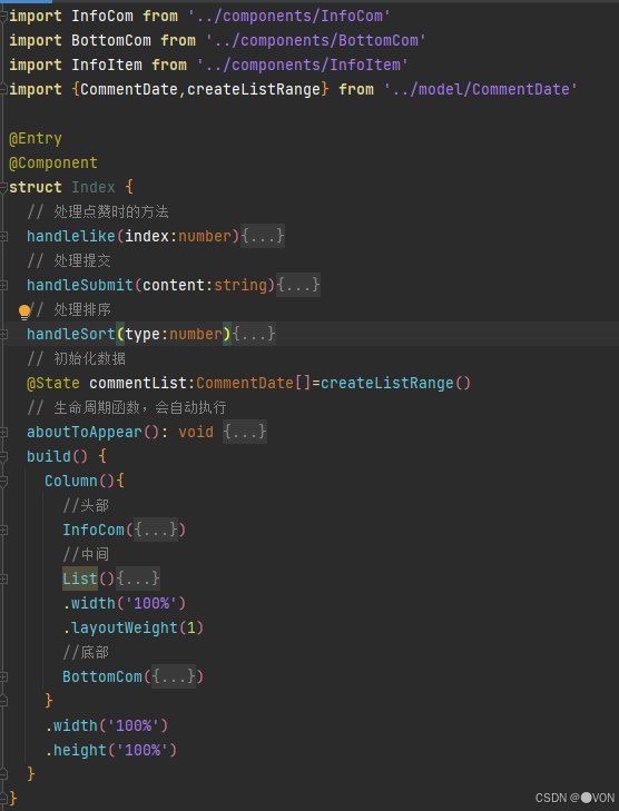 渲染部分用到了CommentDate中的数据来进行逐一渲染的,因为实现交互的是子组件,但是要修改的部分是父组件的一些内容,所以对于可变的数据用到了Prop装饰器进行的装饰。