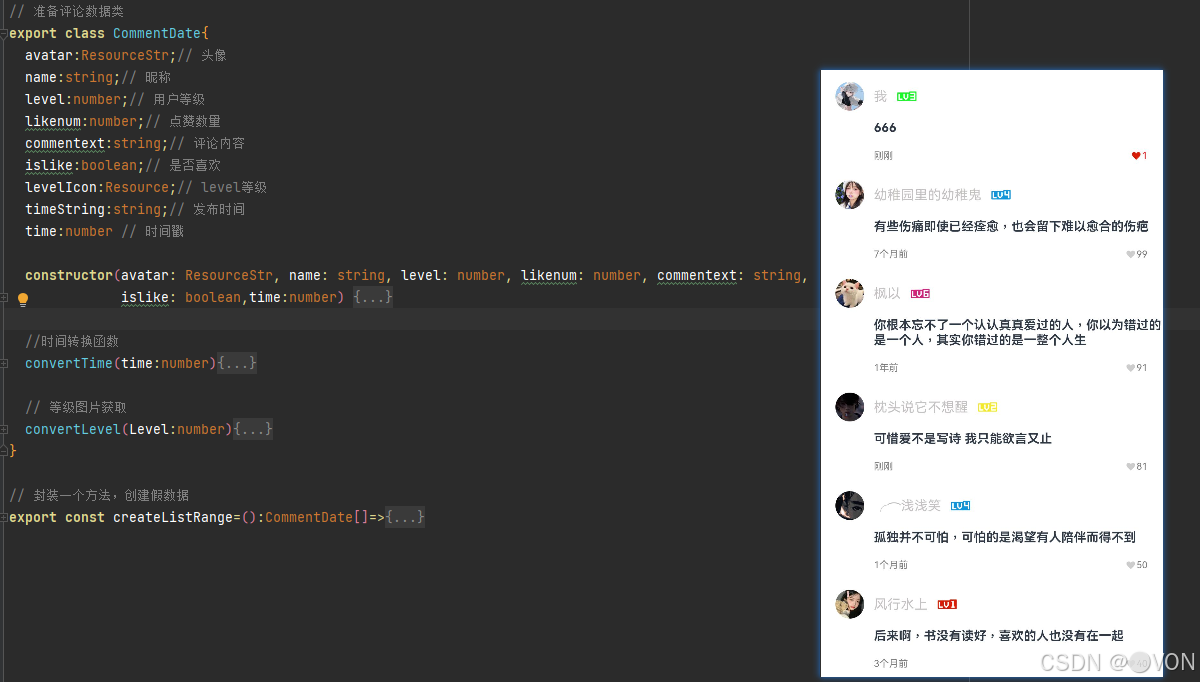 初始数据是自己进行构建的一些数据,这些数据被打包在CommentDate中,其中点赞数和等级是随机的,其他部分都是自定义的。因为这是一个离线的静态页面,并没有实现交互功能所以目前只能这样来代替。