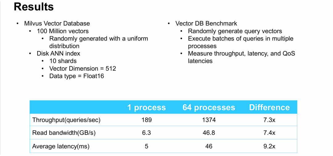 - IOPS与吞吐量/带宽的强相关性: 这张图表揭示了上一张PPT中“为什么”能实现性能扩展。当并发负载从1个进程增加到64个进程时,存储设备(NVMe SSD)的读取IOPS也从2.7万线性增长了7.4倍,达到了20万。