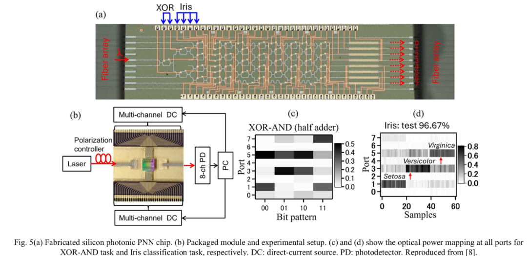 图 5(a)和图 5(b)分别展示了我们开发的硅光子芯片和实验装置。我们通过细菌觅食优化(BFO)和前向差分两种算法实现了片上训练,并证实其在图 5(c)的多布尔逻辑分类和图 5(d)的鸢尾花(Iris)数据集分类任务中具有高准确率。该光子神经网络仅通过无源光子电路中信号的物理传播完成计算,确保了低功耗、低延迟的运算性能。