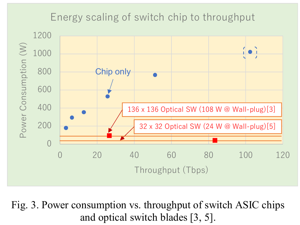 令人意外的是,光收发器的能耗效率提升已追平摩尔定律的步伐,基于硅光子的近封装 / 共封装光学器件已实现低于 5 皮焦 / 比特的能效;而交换机 ASIC 的能效提升则显著滞后。事实上,ASIC 交换机的功耗随吞吐量增加而上升,当吞吐量达到 100 Tbps时,单芯片功耗已超过 1000 W;与之相反,光交换机的功耗始终保持极低且恒定,不受吞吐量增长影响(图 3)。因此,越多地采用光交换替代电交换机,系统能效就越高。以下将讨论相关实际应用问题。