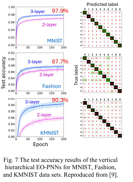 第二个模型是上述模型的级联版本,即 “垂直分层电光光子神经网络(EO-PNN)”,如图 6 所示。在该模型中,所有光路的长度不会随层数增加而延长,从而支持更深层的学习模型。图 7 展示了其在 MNIST、Fashion-MNIST 和 KMNIST 数据集上的测试准确率。结果显示,三层模型的准确率高于两层模型。