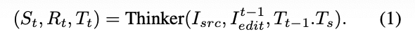 图2。边思考边编辑的流程。EditThinker 是一个多轮指令迭代优化框架。第一轮中,原始图像Isrc和指令T输入编辑器,生成初始编辑图像,进行编辑。这张编辑后的图片连同原始图片和指令,随后被输入 EditThinker,生成编辑分数 St、精细提示 Tt 以及相应的推理过程 Rt。如果分数低于阈值,框架将进入下一次迭代,使用精炼后的提示,直到达到满意结果。