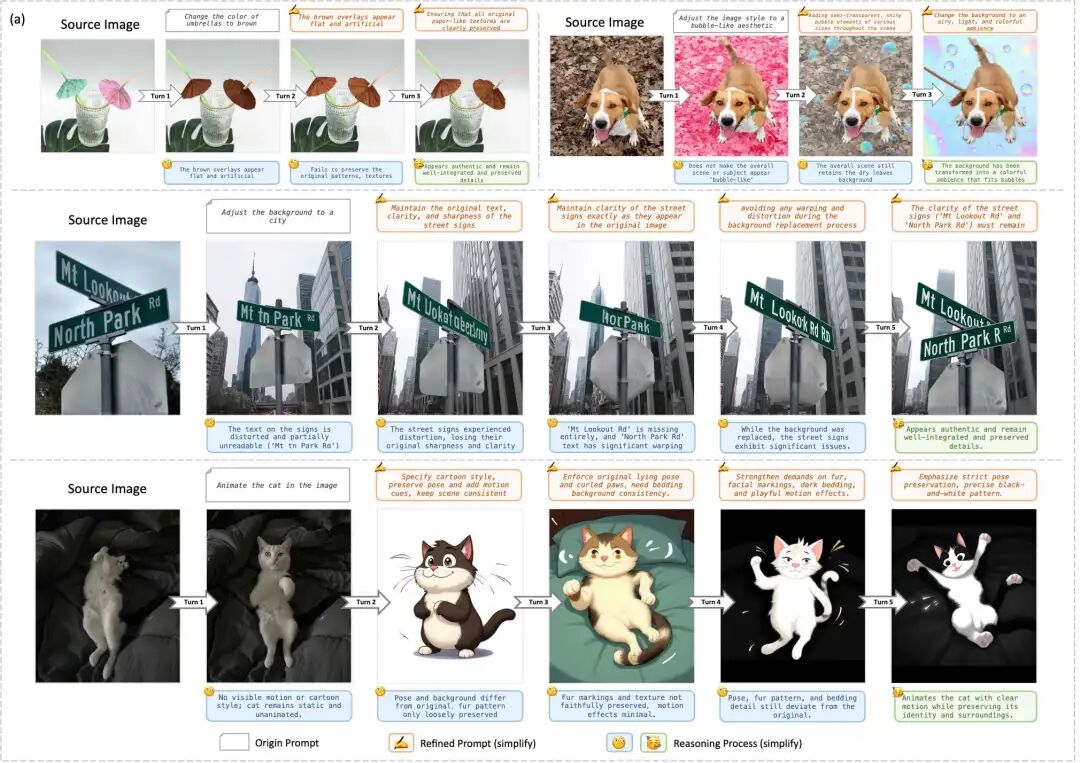 现有基于指令的图像编辑方法受限于单轮执行范式,难以有效应对模型固有的随机性与缺乏推理机制的问题,导致指令遵循准确率低、编辑结果与用户意图存在偏差,尤其在复杂或多步编辑任务中表现不足。