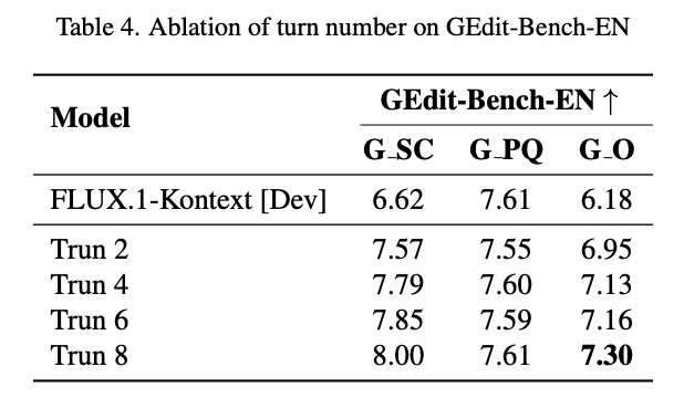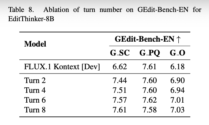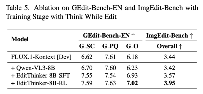 本节总结了对 EditThinker 框架中关键组件的消融研究结果。以 FLUX.1-Kontext [Dev] 模型为基线,并在 GEdit-Bench-EN 和 ImgEdit-Bench 上进行评估。